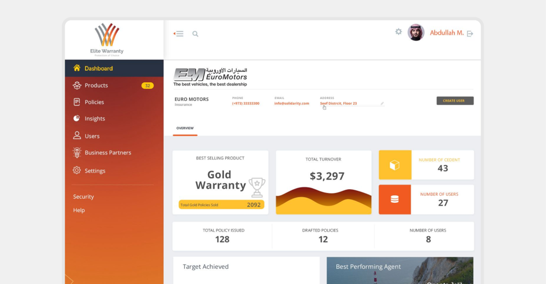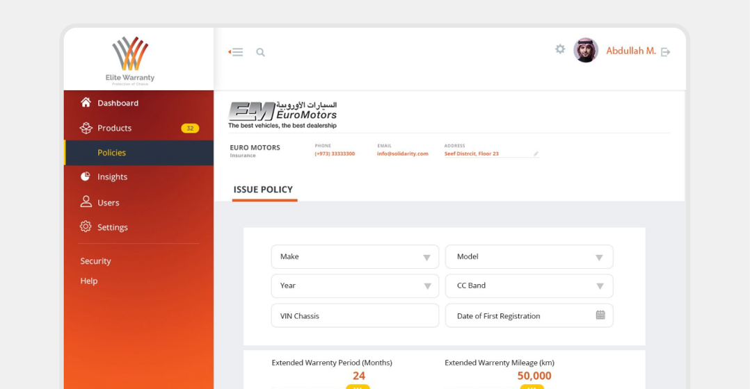 بهدف تحسين إدارة وإصدار سياسات الضمان الممتد. كان المطلوب منصة ذكية تجمع بين أدوات الإدارة الشاملة والكفاءة العالية وقابلية التوسع. تمثل هدفنا في بناء بوابة أعمال قوية لإدارة سياسات الضمان الممتد، تضمن الامتثال التنظيمي، جمع بيانات العملاء بجودة عالية، وتتيح إضافة خدمات مستقبلية بسلاسة.